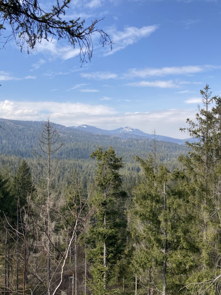 Nach ein paar hundert Metern erreichen wir den Druidenfels, der etwas nach hinten versetzt rechts vom Weg liegt. Hier befindet sich ein Kreuz (Röck-Kreuz) und man hat einen schönen Ausblick auf den Arber.
