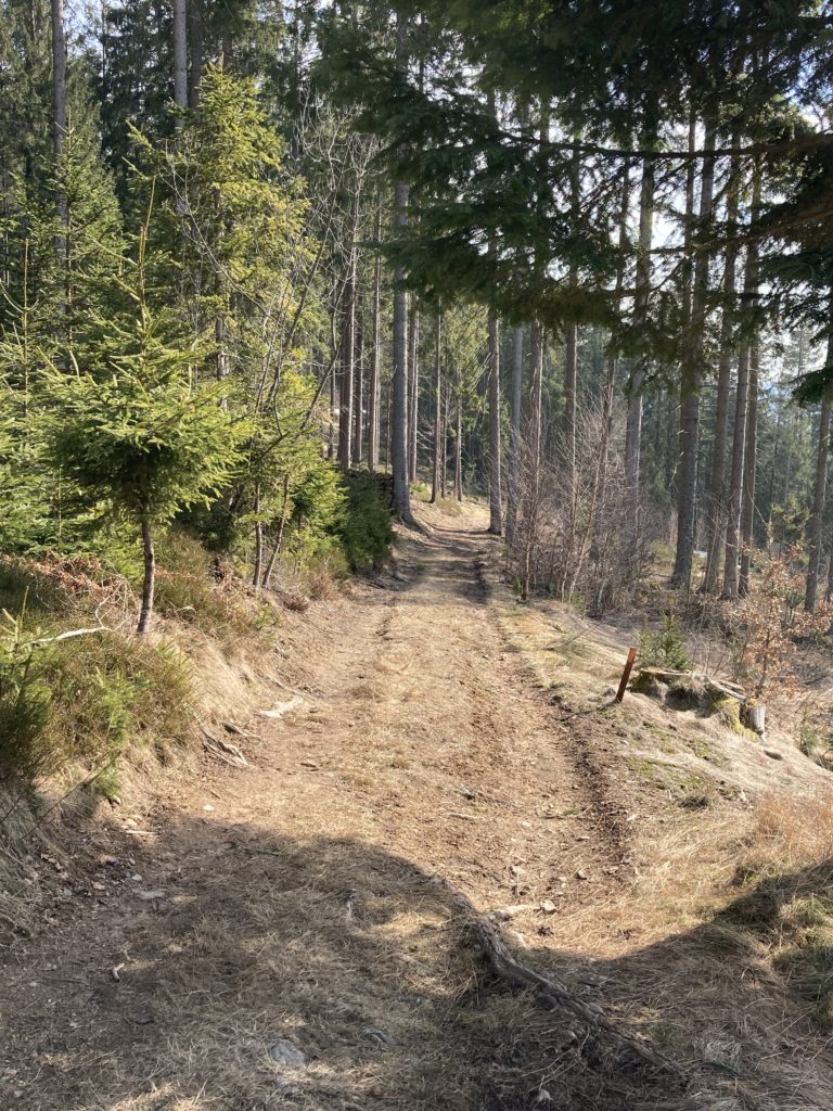 Von diesem Weg biegen wir unmarkiert nach links ab, um zum Dachsenstein zu kommen. Die Stelle ist nicht ganz offensichtlich. Es kommt ein Weg von rechts unten und links ist ein kleiner Trampelpfad nach oben.
