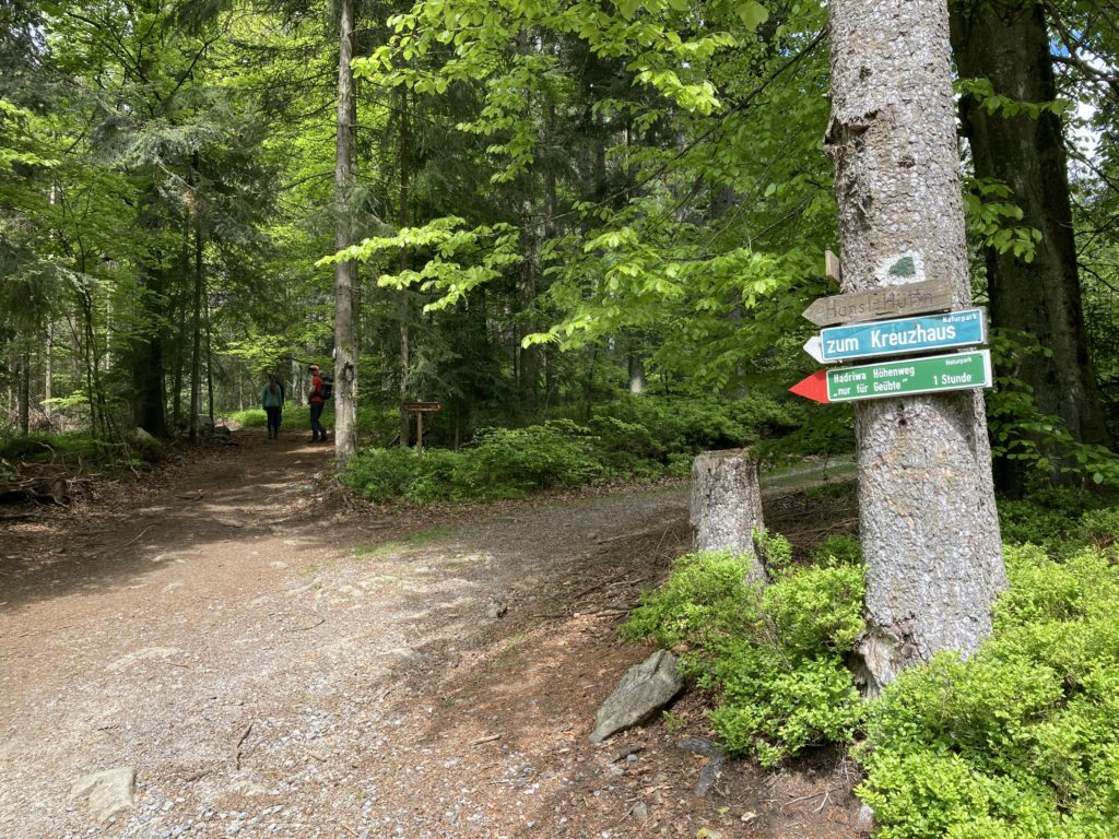 Wir starten direkt in den Wald hinein, an der ersten Weggabelung halten wir uns nach rechts und biegen dann nach links auf den Hadriwa Höhenweg „nur für Geübte“ ab.