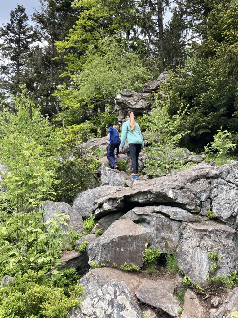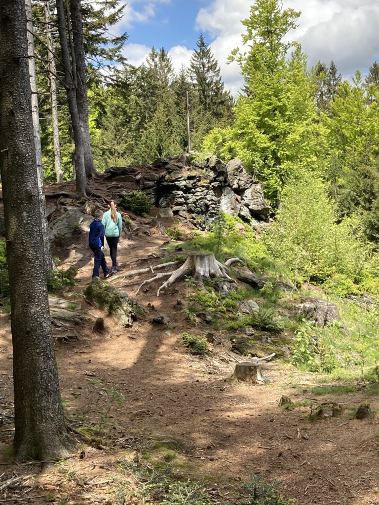 Ab hier beginnt der schönste Teil dieser Tour, denn der Waldweg geht nun in einen sehr felsigen Pfad über. Den größeren Felsen kann man dabei ausweichen, aber wir folgen immer den weißen Punkte um die spannende Route zu durchsteigen.