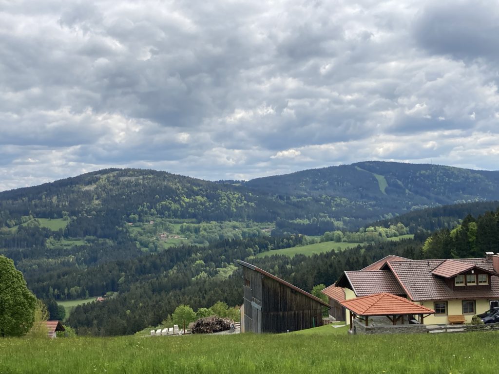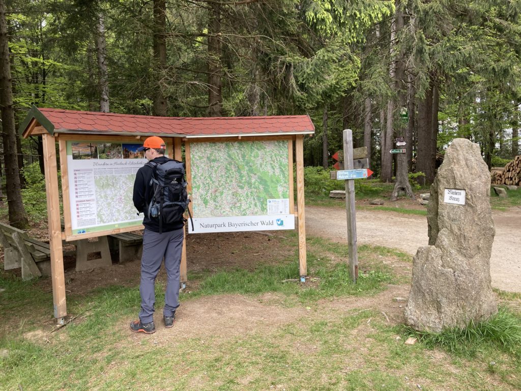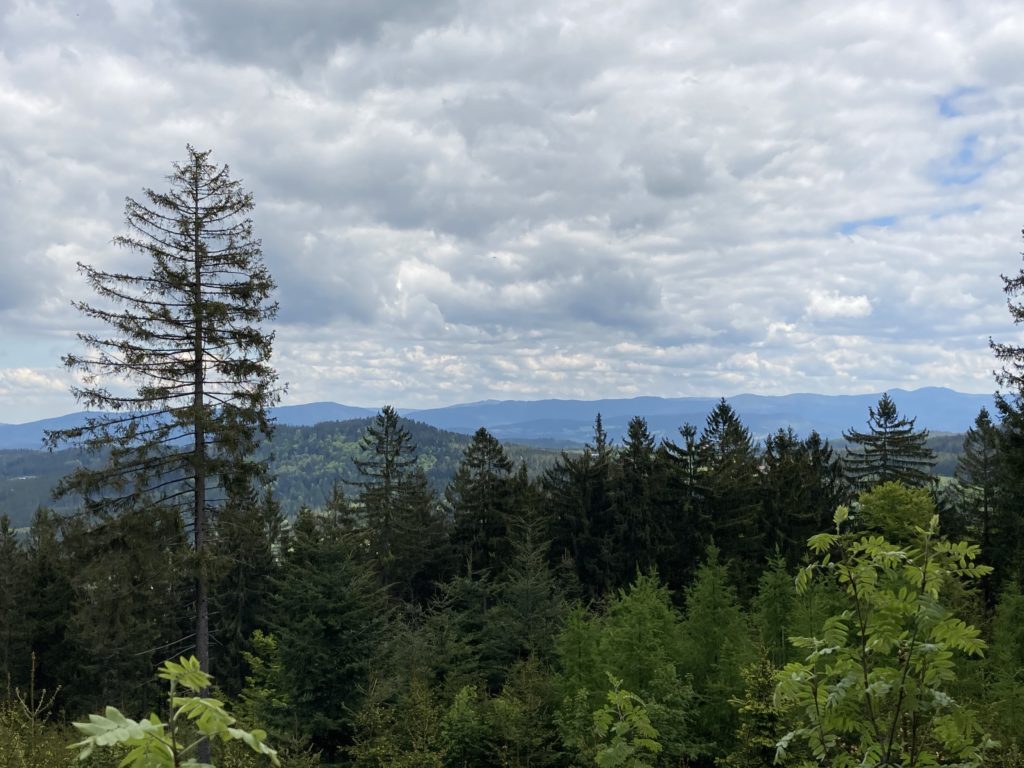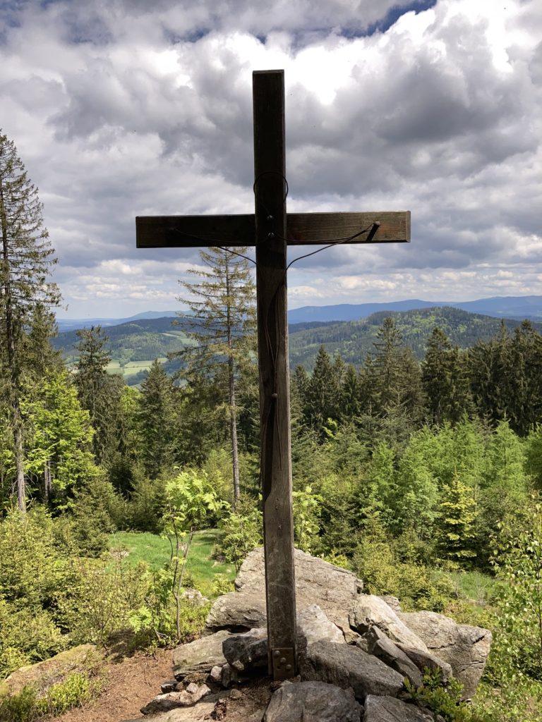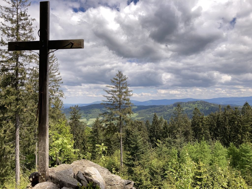 Nach knapp einem Kilometer kommen wir zum Gipfel des Hadriwa (922 m), mit einem Gipfelkreuz und einem fantastischen Ausblick zum Hohen Bogen, Kaitersberg und auf die anderen 8 Tausender bis zum Arber. Sogar die Osser-Spitze ist noch zu erkennen. Direkt vor uns ist außerdem die Käsplatte zu sehen.