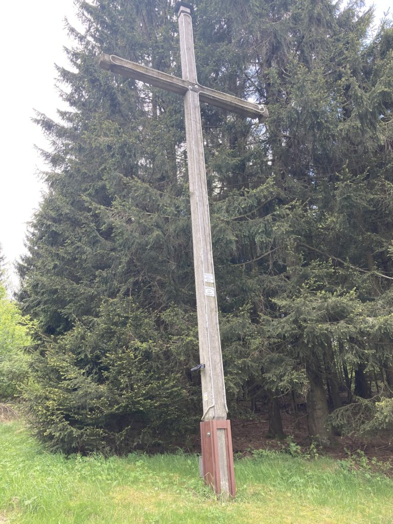 Der Weg führt uns zum Kreuzhaus, samt großem Kreuz davor.