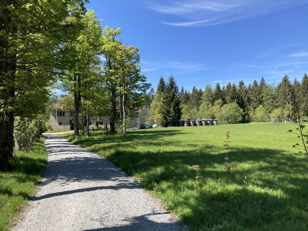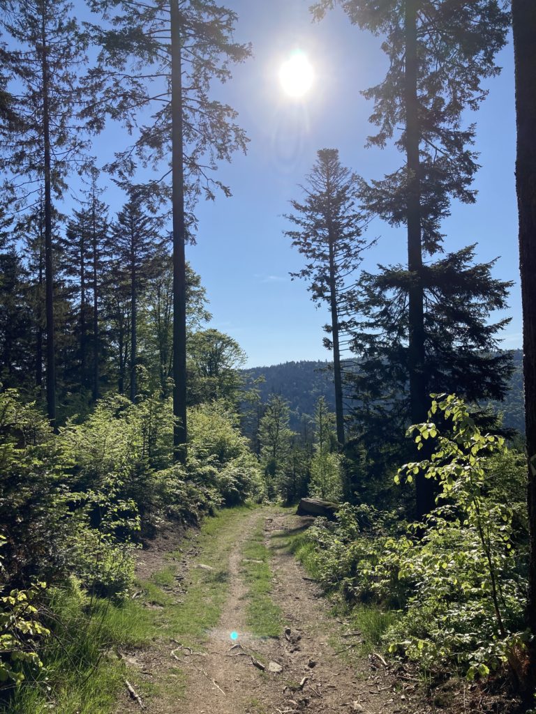 Wir folgen zuerst der Forststraße nach rechts, um dann nach ein paar hundert Metern links in den Goldsteig einzubiegen. Das erste Stück geht es dabei auf einem Waldweg teilweise steil bergauf. Bei einem Blick zurück können wir den Vogelsang zwischen den Bäumen erkennen.