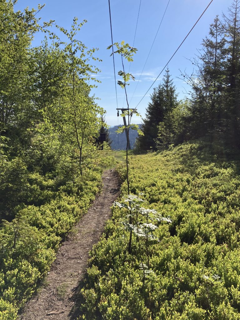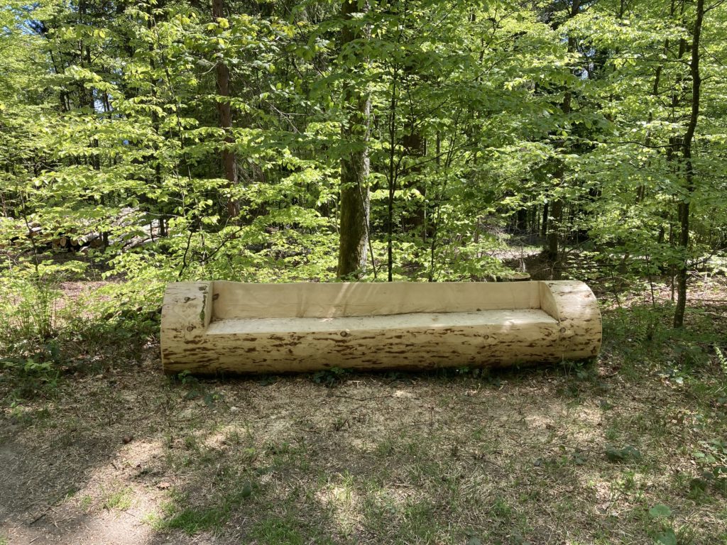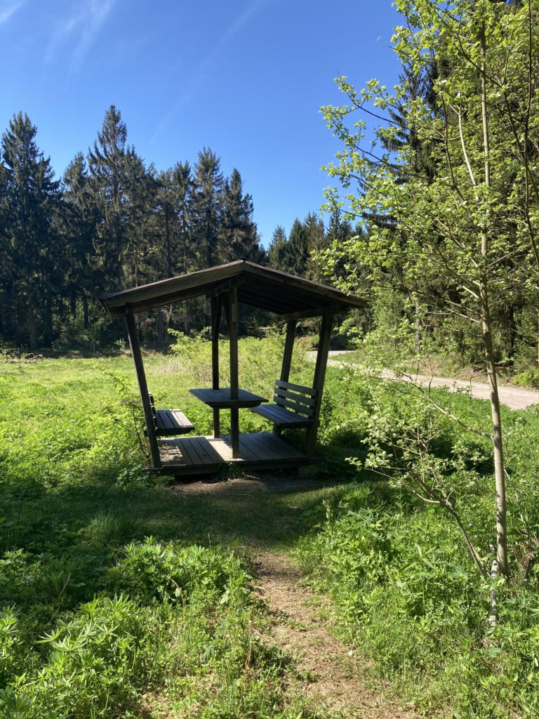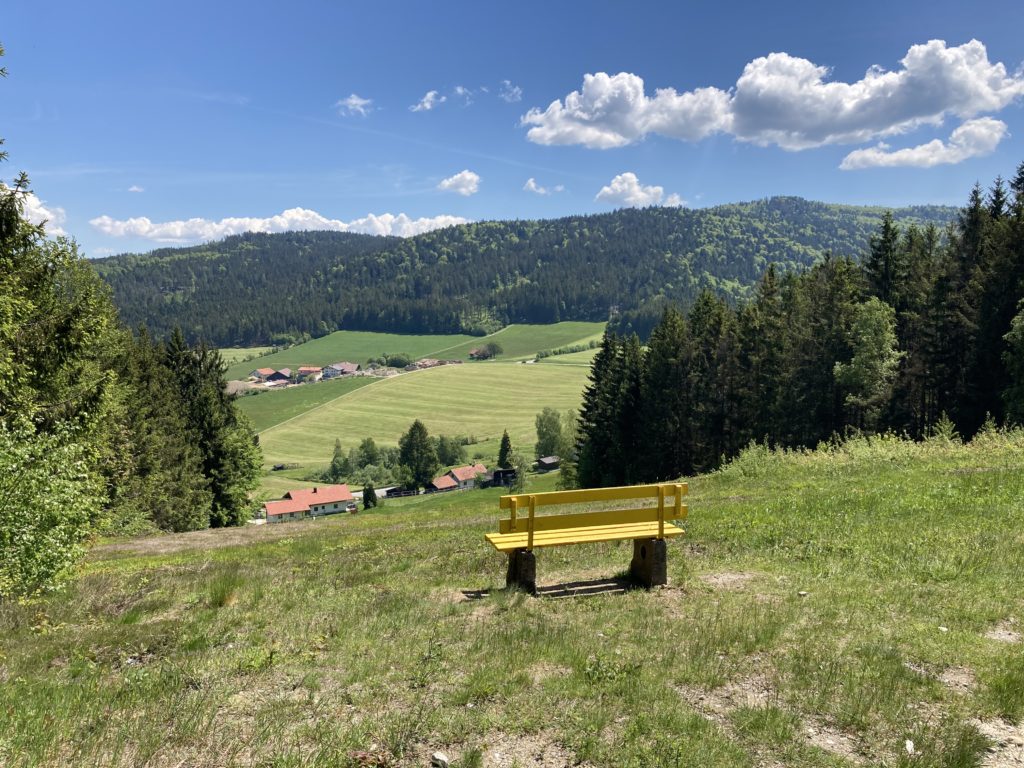 Außerdem überqueren wir kurz vor Schluss noch den ehemaligen Skihang, der mit einer Aussichtsbank zu einer Rast einlädt.