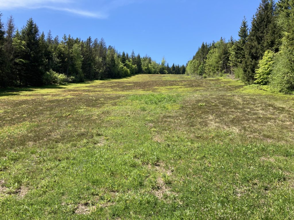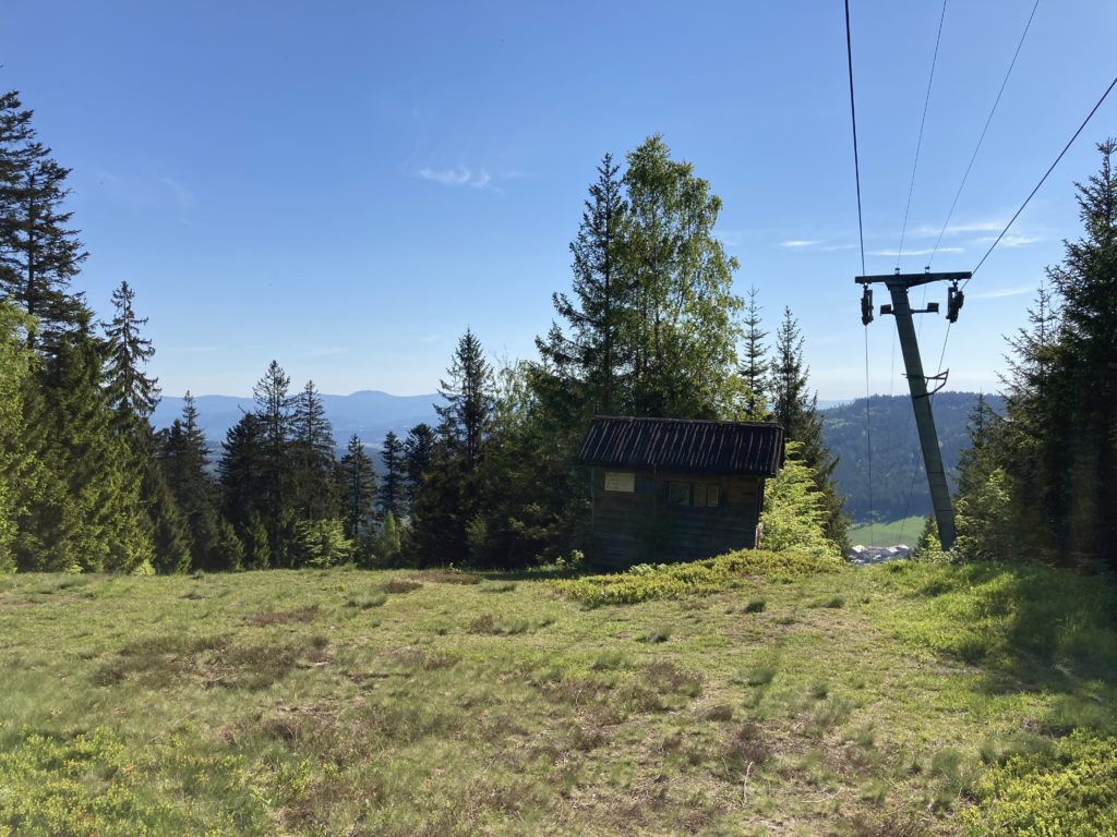 Als wir zum ehemaligen Skilift kommen, machen wir einen kurzen Abstecher nach rechts zum alten Lifthäuschen. Von hier eröffnet sich ein schöner Blick Richtung Arber.