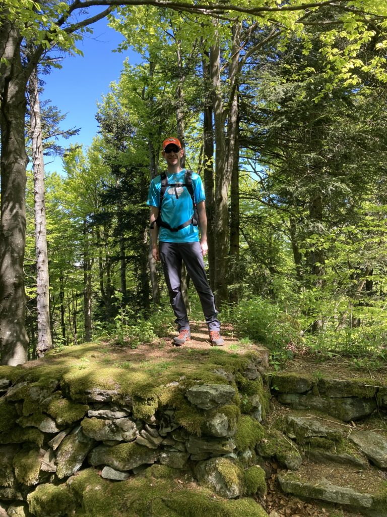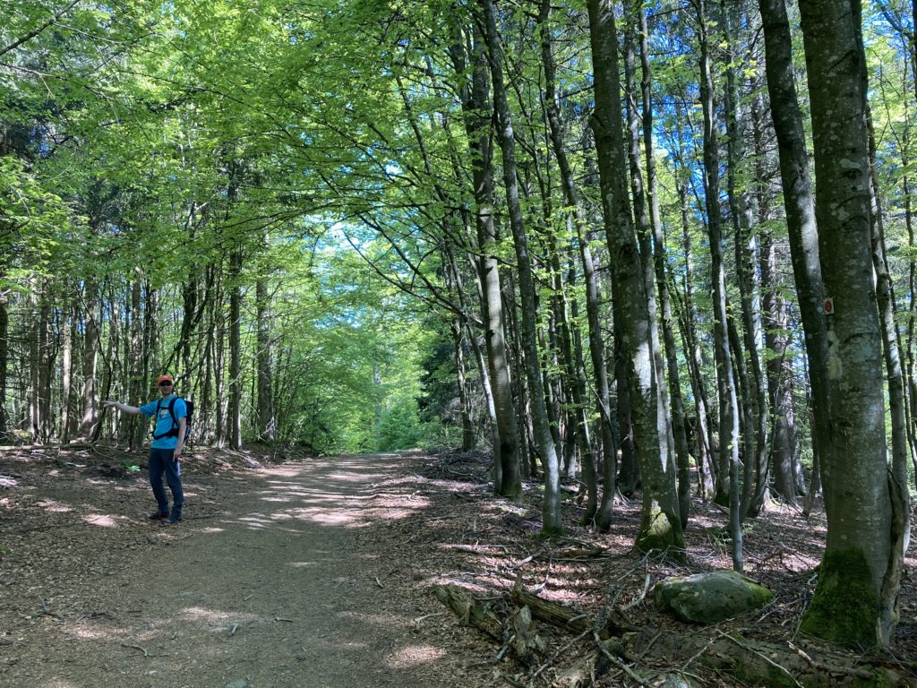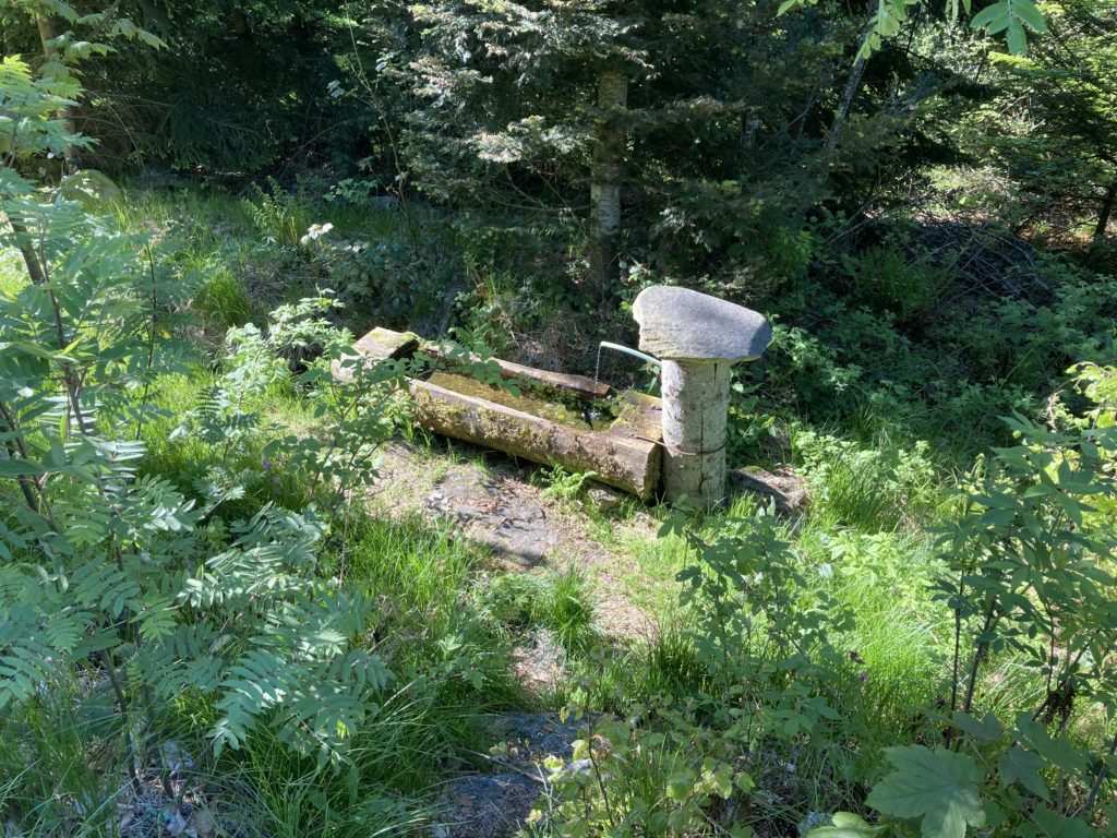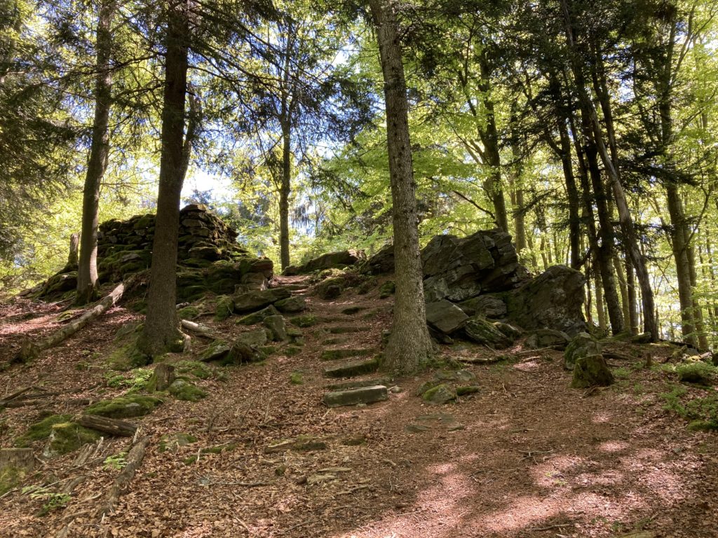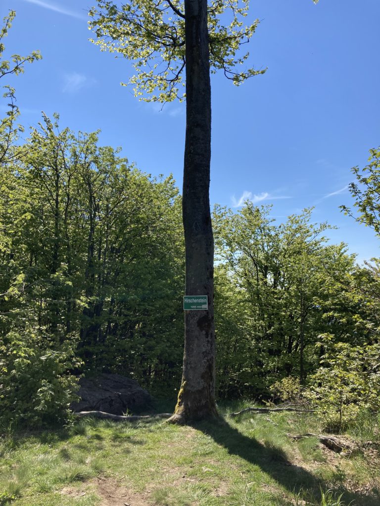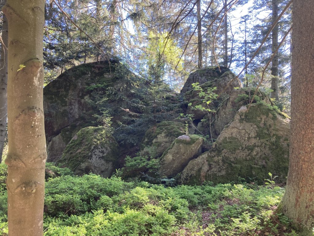 Dazu gehen wir rechts am Forsthaus vorbei und bleiben knapp 200 m auf der Forststraße. Dann biegen wir bei der Markierung Pfeiferbrunnen nach rechts auf einen kleinen Pfad ein. Dieser bringt uns innerhalb ein paar Minuten leicht ansteigend zum Gipfel des Kälberbuckel (1054 m). Aussicht bzw. Gipfelkreuz gibt es hier allerdings nicht, auf den Felsen am höchsten Punkt steigen wir natürlich trotzdem hoch.