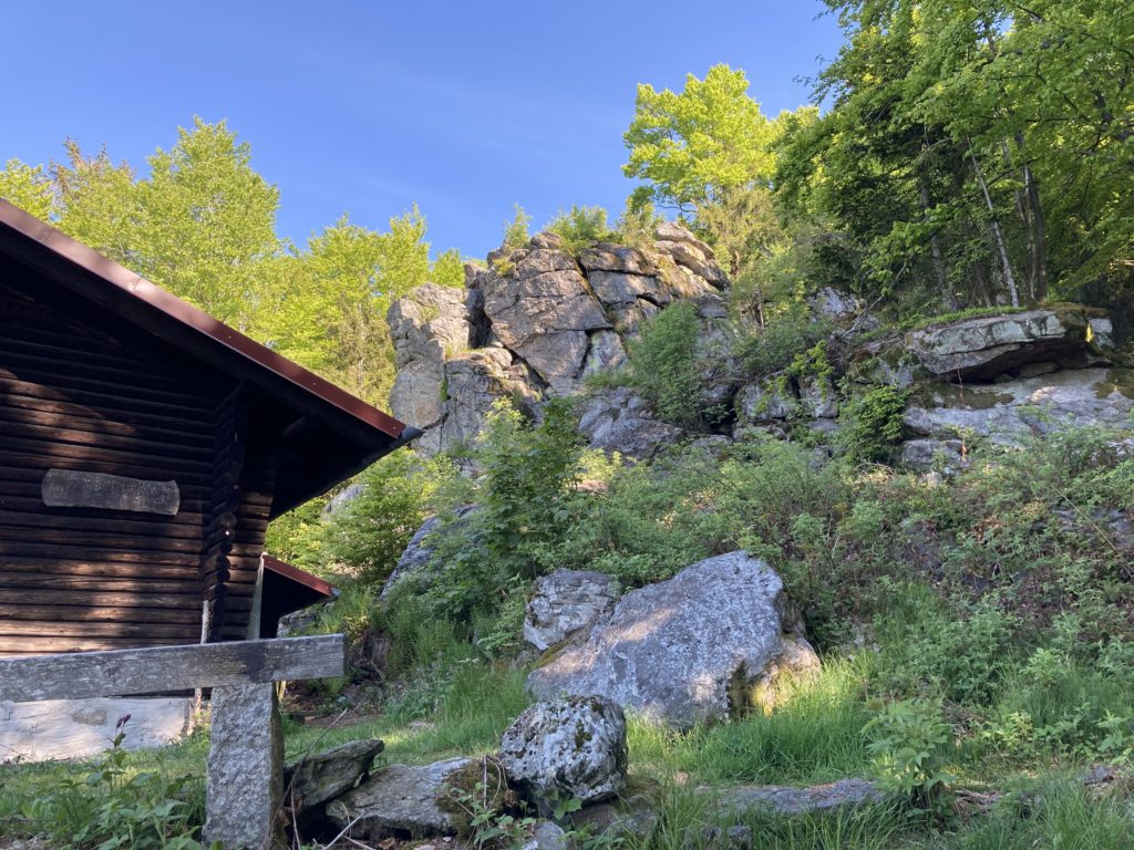 Auf der rechten Seite kommen wir an einer Schutzhütte vorbei. Der Stein dahinter ist allerdings nicht, wie ich immer gemeint habe der Klausenstein.