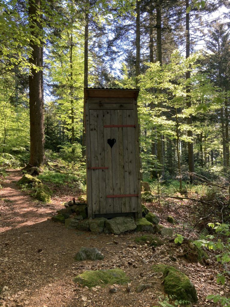 Jetzt gilt es natürlich auf den Felsen zu klettern. Dazu gehen wir rechts an der Hütte vorbei und folgen dem Weg links neben dem Klohäuschen weiter nach oben. Der Weg ist teilweise nicht ganz leicht zu finden, aber wir können uns ja am Felsen orientieren.