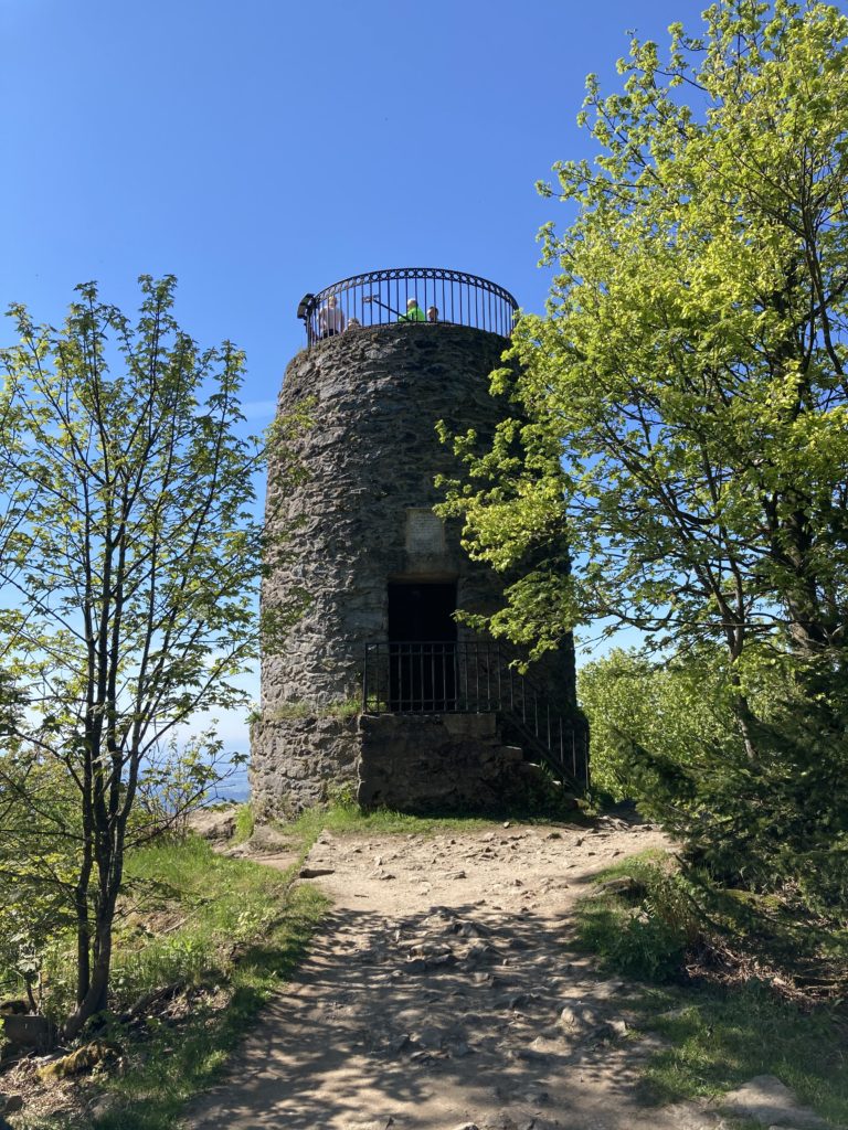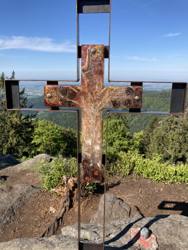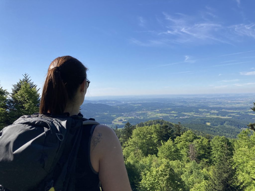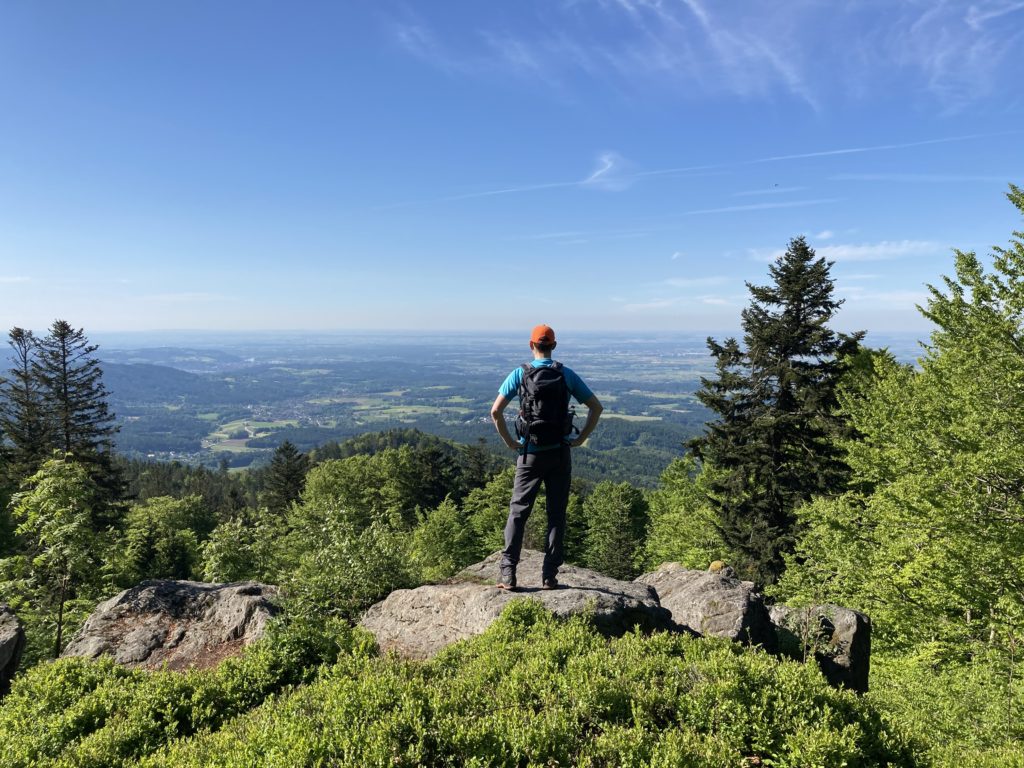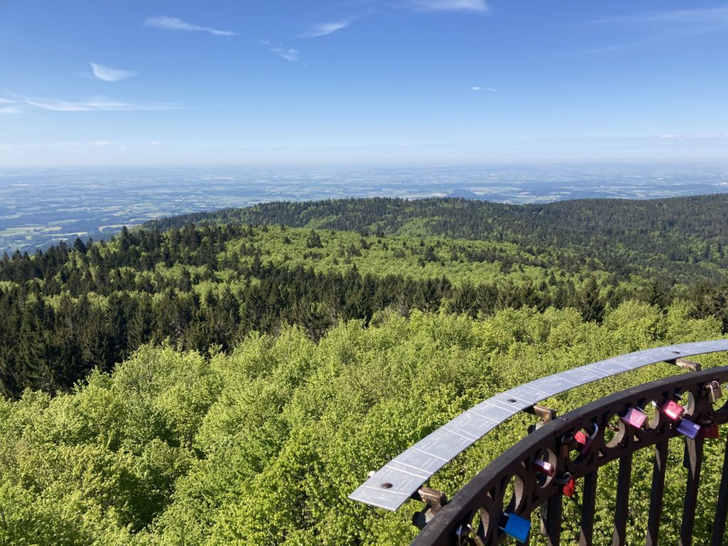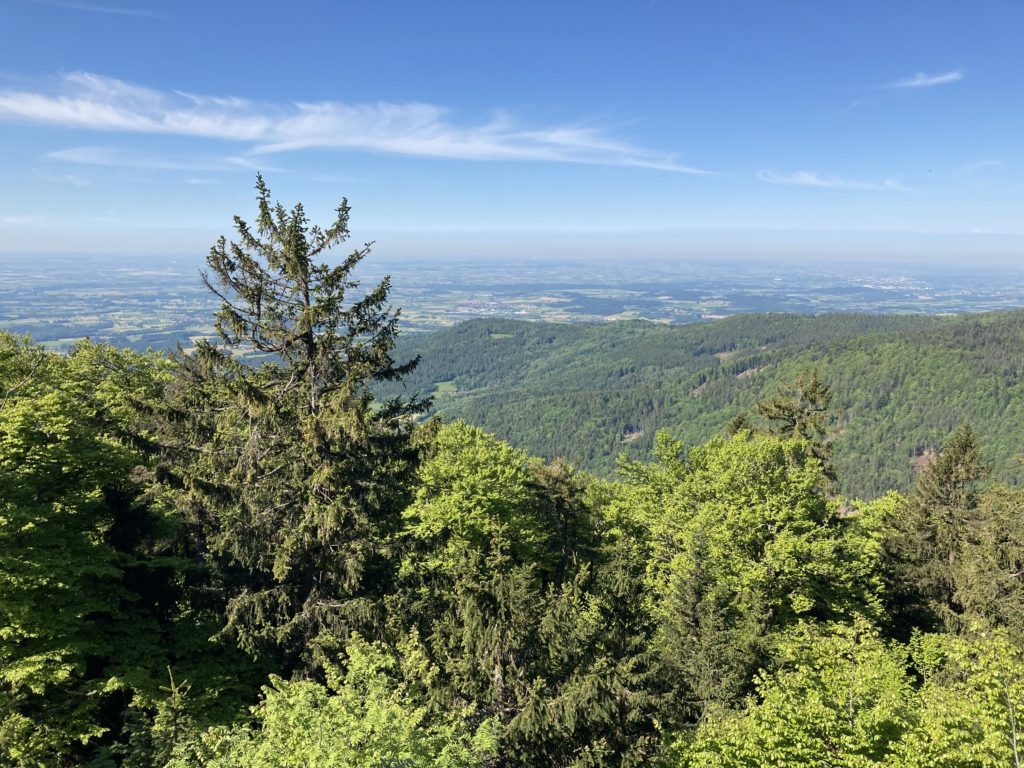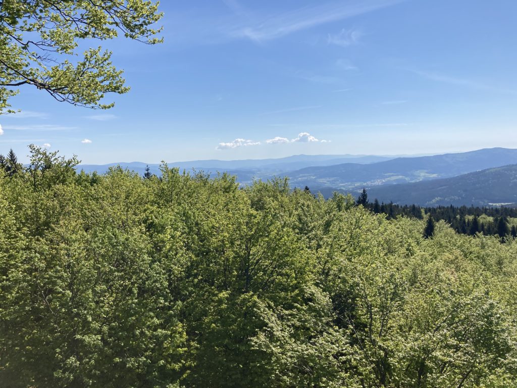 Dieser lockt die Wanderer und auch uns mit seinem neuen Gipfelkreuz an. Darüber hinaus werden wir mit einem sehr schönen Ausblick belohnt. Wenn man nach rechts schaut, kann man schon den Hirschenstein inklusive seinem Aussichtsturm erkennen. Auf der anderen Seite haben wir eine Aussicht bis zum Großen Arber.