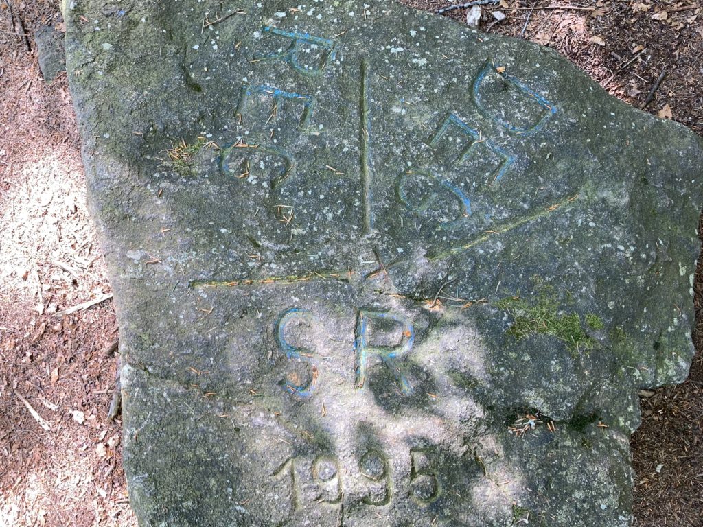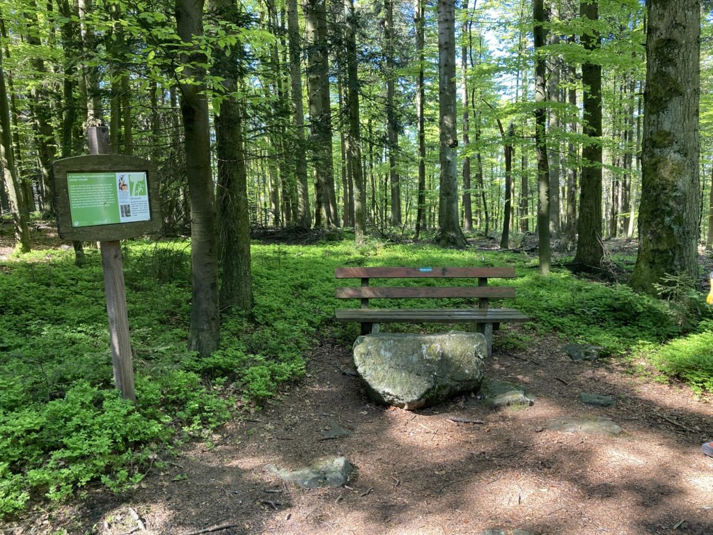 Jetzt geht es erst mal wieder ein Stück nach unten und wir kommen an die Landkreisgrenze zwischen Deggendorf, Regen und Straubing. Diese befindet sich vor einer Rastbank und ist durch einen Stein markiert, auf dem die Grenze eingezeichnet ist. Das sieht man allerdings nur, wenn man direkt von oben drauf schaut.