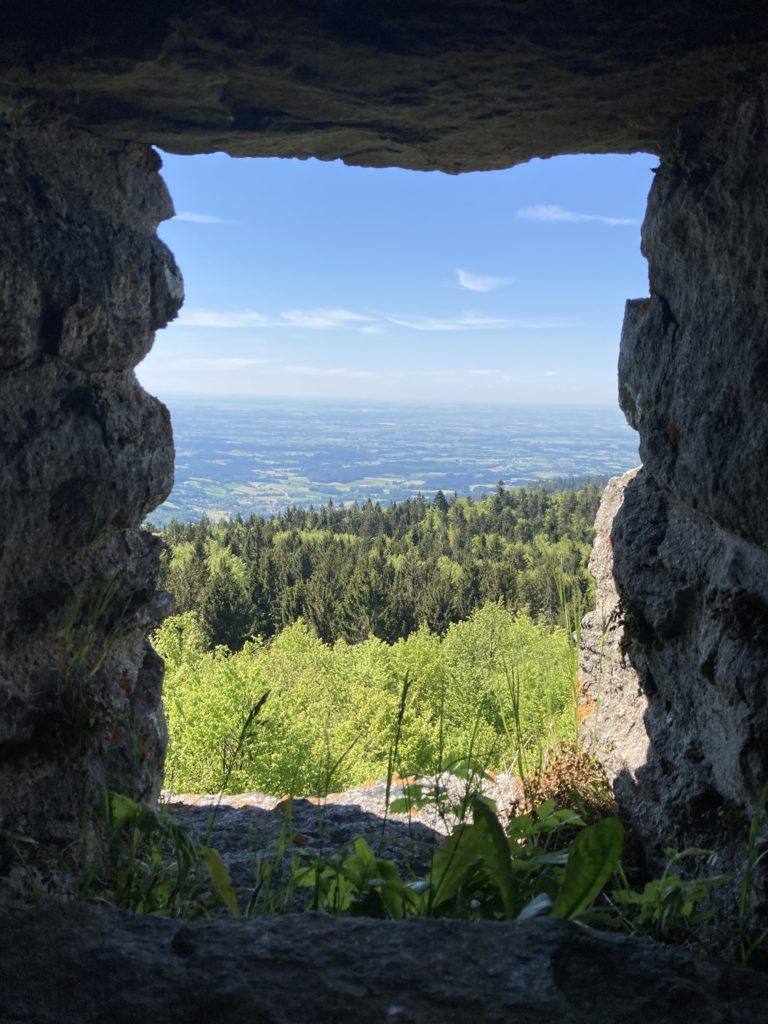 Auch den Rauhen Kulm (1050 m) haben wir wieder für uns alleine und genießen die Aussicht ins Tal, allerdings etwas von den hohen Bäumen vor uns eingeschränkt. Gipfelkreuz ist hier keines zu finden.