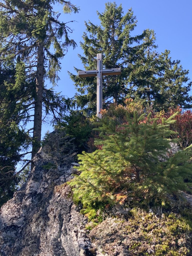 Ich wandere an die höchste Stelle und genieße kurz den Ausblick. Da ich weiß, dass es hier auch ein Gipfelkreuz geben soll, mache ich mich auf die Suche. Diese gestaltet sich nicht ganz einfach und ist auf dem felsigen Untergrund auch nicht ungefährlich.